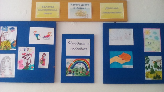 Организована персональная выставка творческих работ учащихся: Калык Ляззат 11 класс, Байсмаковой Раушан 9 класс, Куропаткиной Марии 9 класс.